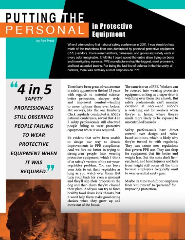These three examples and thousands of others like them show that PPE is a personal issue. The war of PPE compliance is won or lost in the decisions and habits of each worker.