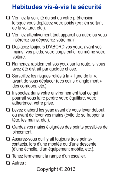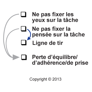 Malgré cela, la nature humaine étant ce qu’elle est, même si l’on identifi e bien où et à quel moment nous serons dans l’un de ces états, il est possible – et même probable – que notre esprit s’éloignera à l’occasion. C’est pour cette raison qu’il est important de réfl échir en termes de sécurité, aux habitudes que nous devons améliorer, afi n que ce que nous faisons de façon plus ou moins automatique, puisse être fait de façon sécuritaire. En ce sens, il peut s’agir tout aussi bien de s’assurer d’avoir les trois points-contacts, lors d’une montée ou d’une descente dans une échelle – que de s’assurer que nos yeux se déplacent, avant nos mains, nos pieds, notre corps entier ou même notre voiture. (Voir tableau #2, ci-dessous)